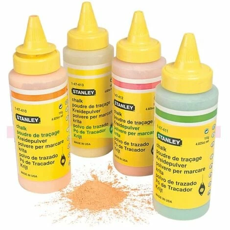 Suitable for all chalk lines, these chalk refills are manufactured from food grade calcium carbonate. Each product supplies good colour fastness and weather resistance. Supplied in twist and pour bottles, the product is available in three colours: Blue for general use externally and internally, Red for exterior masonry work indelible in use and White for interior work such as carpet fitting.