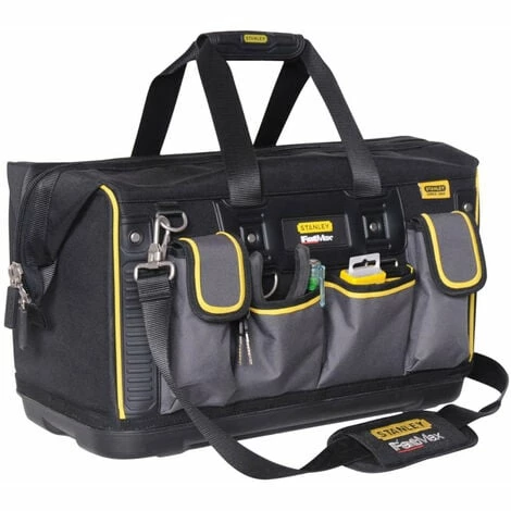 Stanley STA171180 FatMax Open Mouth Rigid Tool Bag 20 Inch has an injected polypropylene base which protects the bag from moisture and dirt. The Stanley FatMax Open Mout Rigid Tool Bag 20 Inch also features a padded shoulder strap and rubber grip handle for comfortable carrying. The tool bag also features a hard-wearing, strong and durable material to stop cuts and scratches.