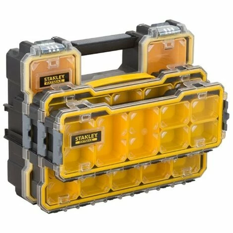 Stanley fatmax pro organiser range features durable transparent polycarbonate lids that makes it easy to view and access the stored parts. The PRO organisers family can be fully stacked and carried together due to the compatible side latches. This versatility allows for a combination of various organiser sizes, with new small cups, that create a complementary family of products that utilise the organisation of small parts. The toolbox has a water seal which has an IP53 waterproof rating, which will ensure the safe and dry storage of all your parts during transportation.