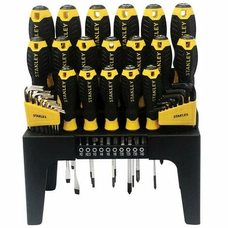 44 Piece Stanley Screwdriver Set, contains a selection of useful screwdrivers for everyday use. Fitted with comfortable handles and supplied in a handy storage rack that can stand on a work surface or be screwed into a wall.